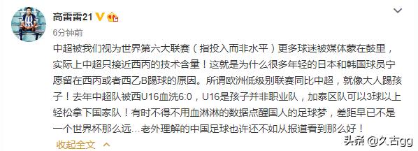 2019年9月10日,前国安球员高雷雷曾发过这样一条微博,称中超的水平其实只是接近西丙的技术含量!去年(2018年)中超球队被西U16血洗6-0,加泰区队可以3球轻松拿下国足,而国内很多球迷还蒙在鼓里!这就是为什么很多年轻的日本和韩国球员宁愿留在西丙或者西乙踢球的原因。