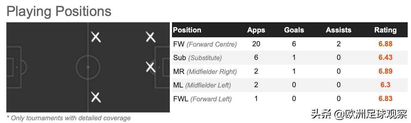 从技术特点上说,哈兰德虽然身材高大,但其实不是支点中锋,头球能力和做球能力也相对较弱。他更像一名突击型前锋,有着非常出色的速度和脚下技术;同时,哈兰德小范围内的调整能力和终结能力都可圈可点。(有点二前锋的意思)