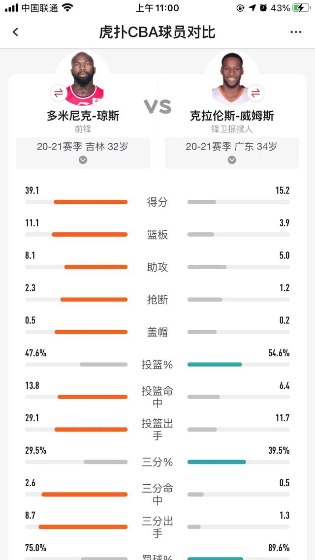 如果我再把琼斯的数据和上赛季到目前MVP广东队的威姆斯做一下对比
