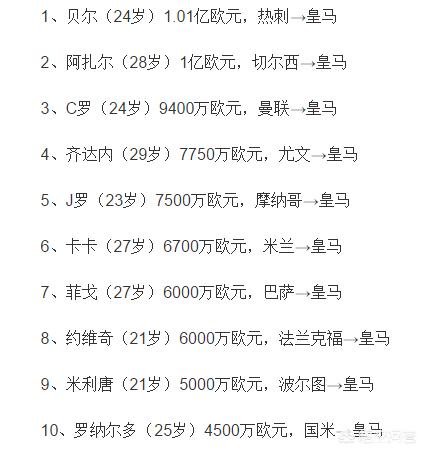 C罗(24岁)9400万欧元。可以看出皇马不愧为世界顶级豪门,接连完成了轰动足坛的转会新闻,确实让我们感叹不已。但是我认为单纯的看一个球员的转会身价是毫无用处的,而且是针对这种不同时期的转会。就像当时齐达内转会皇马,尽管当时法国人已经29岁,但皇马还是毫不犹豫的花费7750万欧元购下他,如果从现在的眼光来看数额确实不高,但那是当时毫无悬念的世界第一,远远超出了同一时期的其它转会,这一纪录直到2009年才被C罗的9400万欧元打破。但是在01年,货币膨胀率还很低,换算下来齐祖的转会费今天远超过亿欧元,所以在价值上已经远超皇马历史转会的很多人。