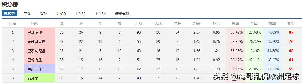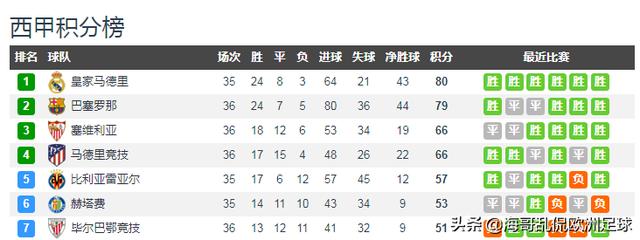 随着6月22日西甲联赛第30轮,皇家马德里2:1拿下了皇家社会,一度落后巴塞罗那的皇家马德里终于追上了对手同积65分,并且因为双方胜负关系皇家马德里还力压巴塞罗那站到了西甲榜首位置。此后巴塞罗那连续被塞尔塔和马德里竞技逼平,如今少赛一轮的皇家马德里依然还能以1分优势力压巴萨保有联赛积分榜首位。